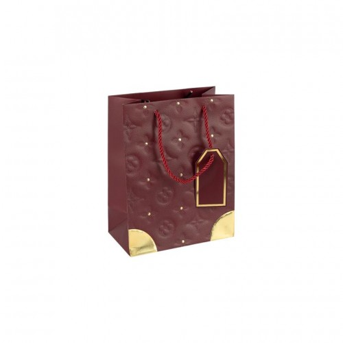 Подарунковий пакет із декоративним золотим оформленням — стильне рішення для презентабельного пакування товарів. Висота — 15 см, ширина — 12 см, ширина дна — 7 см. Матеріал — щільний картон із фактурним тисненням, ручка виконана з текстильного шнура. Золотий декор і посилені кутики розташовані на лицьовій стороні пакета. Компактний формат підходить для пакування прикрас, косметики, невеликих аксесуарів і сувенірів. Міцна конструкція та стійке дно забезпечують зручність під час перенесення. Товар вигідний для оптових магазинів і підходить для роздрібного продажу. Ціна вказана за 1 одиницю товару, продається упаковкою по 12 шт.
