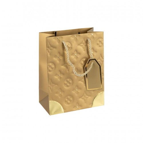 Подарунковий пакет із декоративним золотим оформленням — стильне рішення для презентабельного пакування товарів. Висота — 23 см, ширина — 18 см, ширина дна — 10 см. Матеріал — щільний картон із фактурним тисненням, ручка виконана з текстильного шнура. Золотий декор і посилені кутики розташовані на лицьовій стороні пакета. Формат підходить для пакування косметичних наборів, невеликих коробок, аксесуарів і сувенірів. Міцна конструкція та стійке дно забезпечують зручність під час перенесення. Товар вигідний для оптових магазинів і підходить для роздрібного продажу. Ціна вказана за 1 одиницю товару, продається упаковкою по 12 шт.