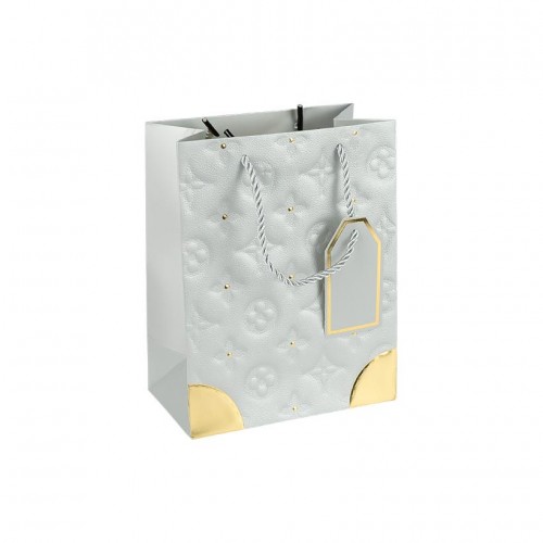 Подарунковий пакет із декоративним золотим оформленням — стильне рішення для презентабельного пакування товарів. Висота — 23 см, ширина — 18 см, ширина дна — 10 см. Матеріал — щільний картон із фактурним тисненням, ручка виконана з текстильного шнура. Золотий декор і посилені кутики розташовані на лицьовій стороні пакета. Формат підходить для пакування косметичних наборів, невеликих коробок, аксесуарів і сувенірів. Міцна конструкція та стійке дно забезпечують зручність під час перенесення. Товар вигідний для оптових магазинів і підходить для роздрібного продажу. Ціна вказана за 1 одиницю товару, продається упаковкою по 12 шт.