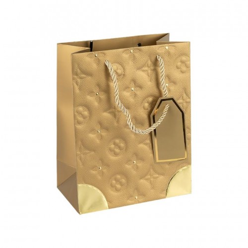 Подарунковий пакет із декоративним золотим оформленням — стильне рішення для презентабельного пакування товарів. Висота — 32 см, ширина — 26 см, ширина дна — 12 см. Матеріал — щільний картон із фактурним тисненням, ручка виконана з текстильного шнура. Золотий декор і посилені кутики розташовані на лицьовій стороні пакета. Пакет підходить для пакування одягу, косметичних наборів і коробок середнього формату. Міцна конструкція та стійке дно забезпечують зручність під час перенесення. Товар вигідний для оптових магазинів і підходить для роздрібного продажу. Ціна вказана за 1 одиницю товару, продається упаковкою по 12 шт.