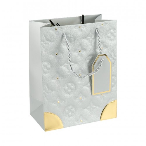 Подарунковий пакет із декоративним золотим оформленням — стильне рішення для презентабельного пакування товарів. Висота — 42 см, ширина — 31 см, розмір дна — 12 см. Матеріал — щільний картон із фактурним тисненням, ручка виконана з текстильного шнура. Золотий декор і посилені кутики розташовані на лицьовій стороні пакета. Пакет підходить для пакування одягу, наборів, коробок і подарунків середнього розміру. Міцна конструкція та стійке дно забезпечують зручність під час перенесення. Товар вигідний для оптових магазинів і підходить для роздрібного продажу. Ціна вказана за 1 одиницю товару, продається упаковкою по 12 шт.